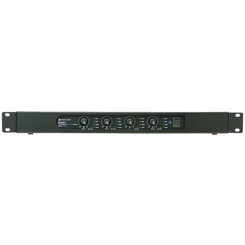 Com potência de 4x 350W em 2O, 4O ou 8O dual/stereo ou 2x 700W @ 4O, 8O ou 16O bridge, o NA 4350 é o modelo de 4 canais da Série Nano.